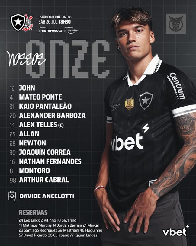 O Botafogo está pronto para enfrentar o Corinthians neste sábado (26), às 18h30, no Estádio Nilton Santos, em partida válida pela 17ª rodada do Campeonato Brasileiro. O técnico Davide Ancelotti promove mudanças importantes na equipe titular, com as entradas de Mateo Ponte, Allan e Nathan Fernandes. Por outro lado, Vitinho e Savarino iniciam no banco de reservas. Marlon Freitas é desfalque por suspensão.